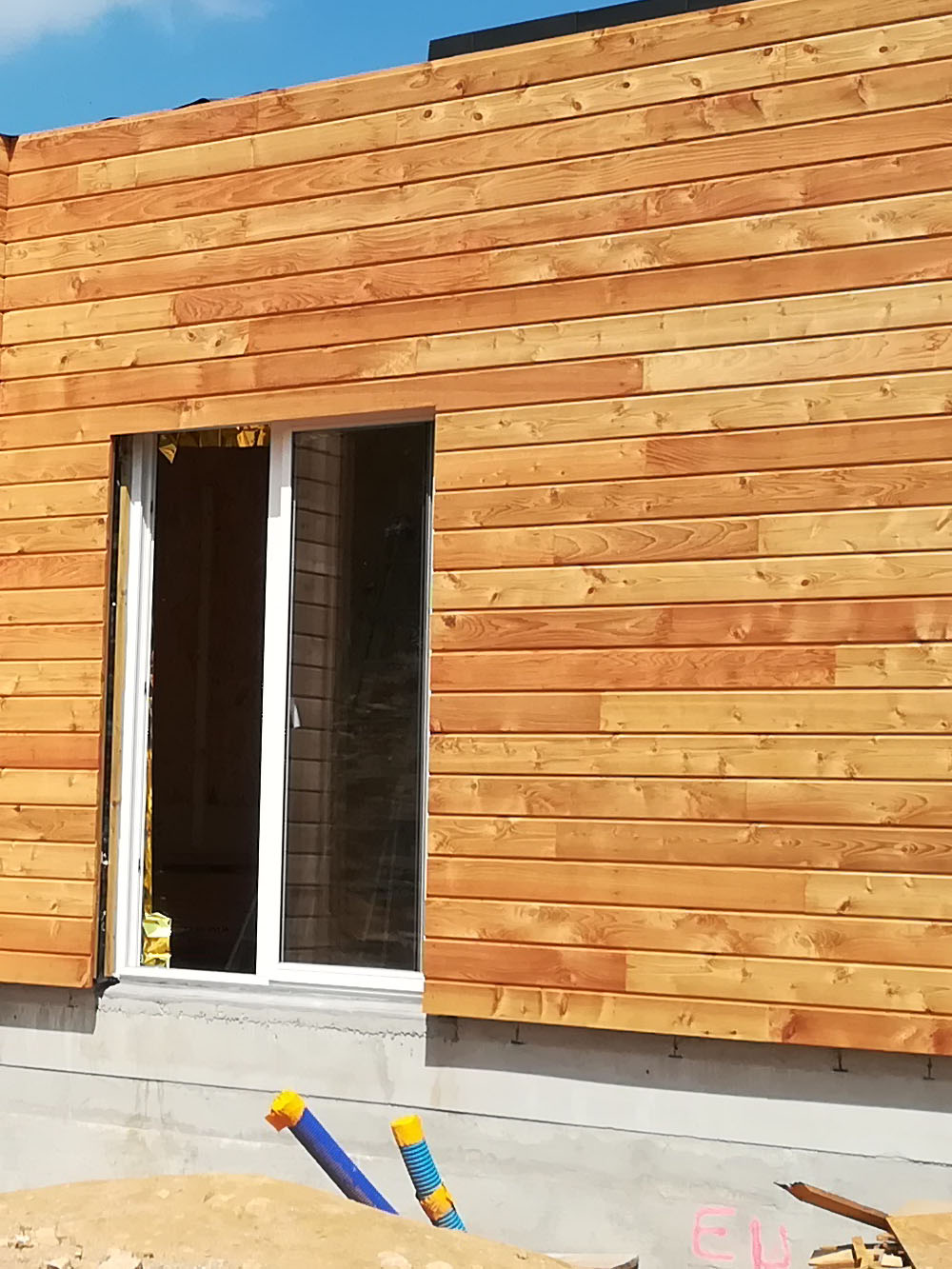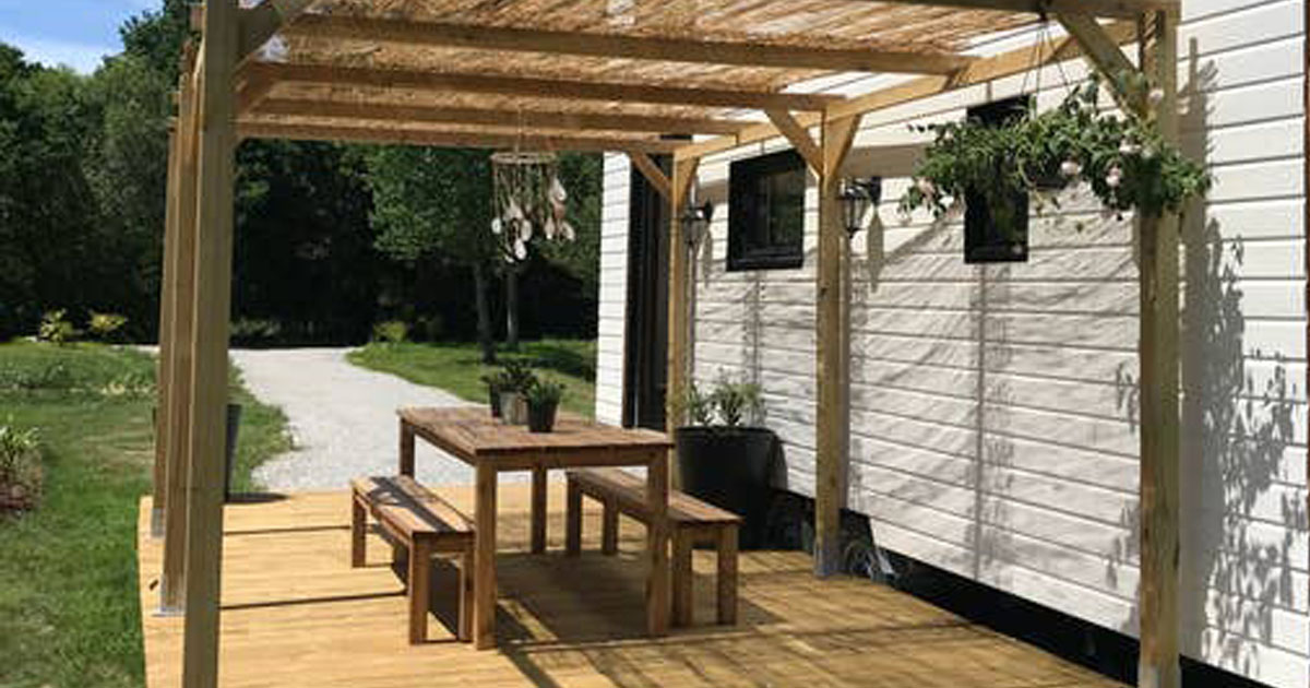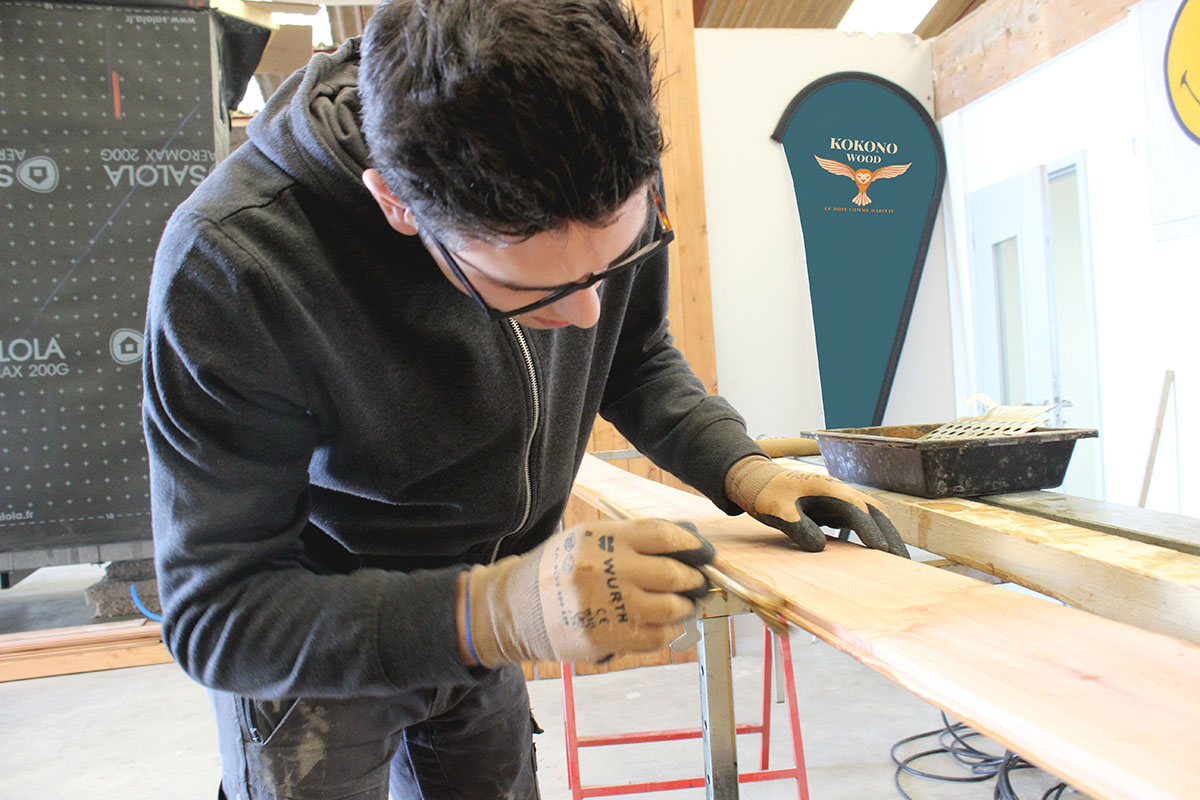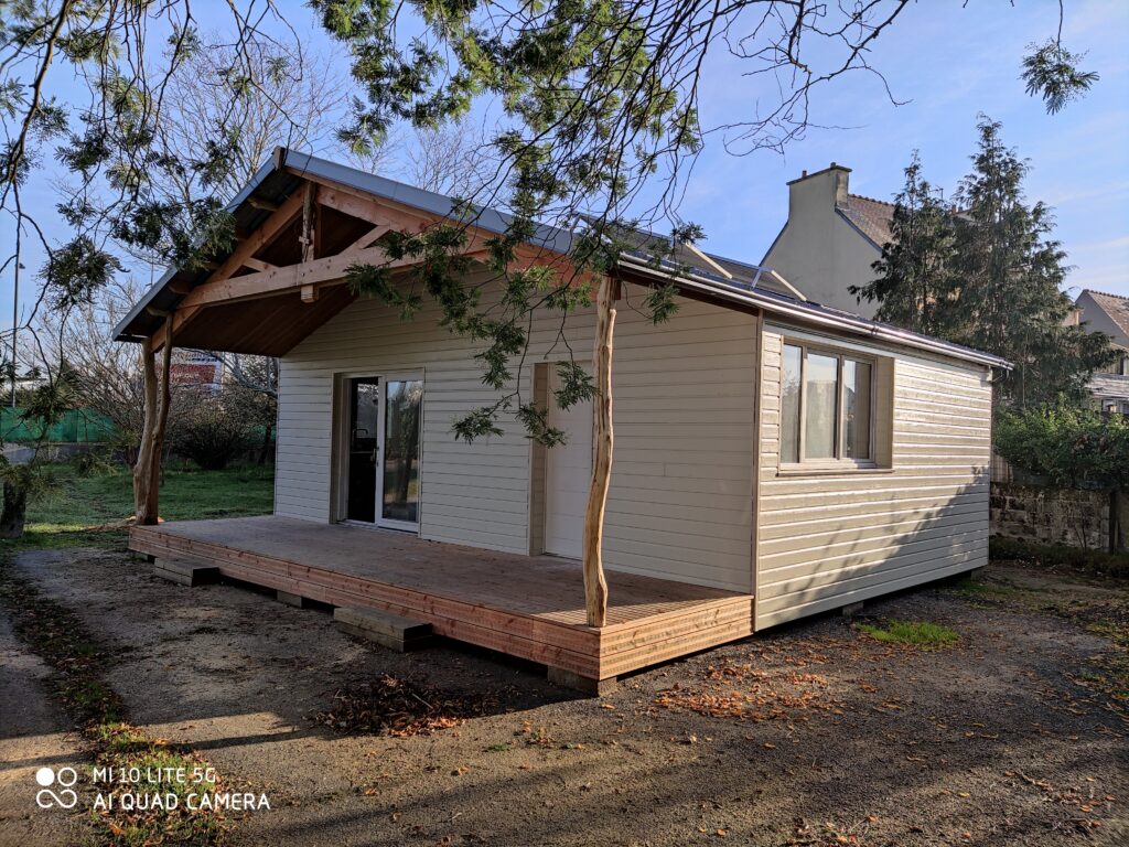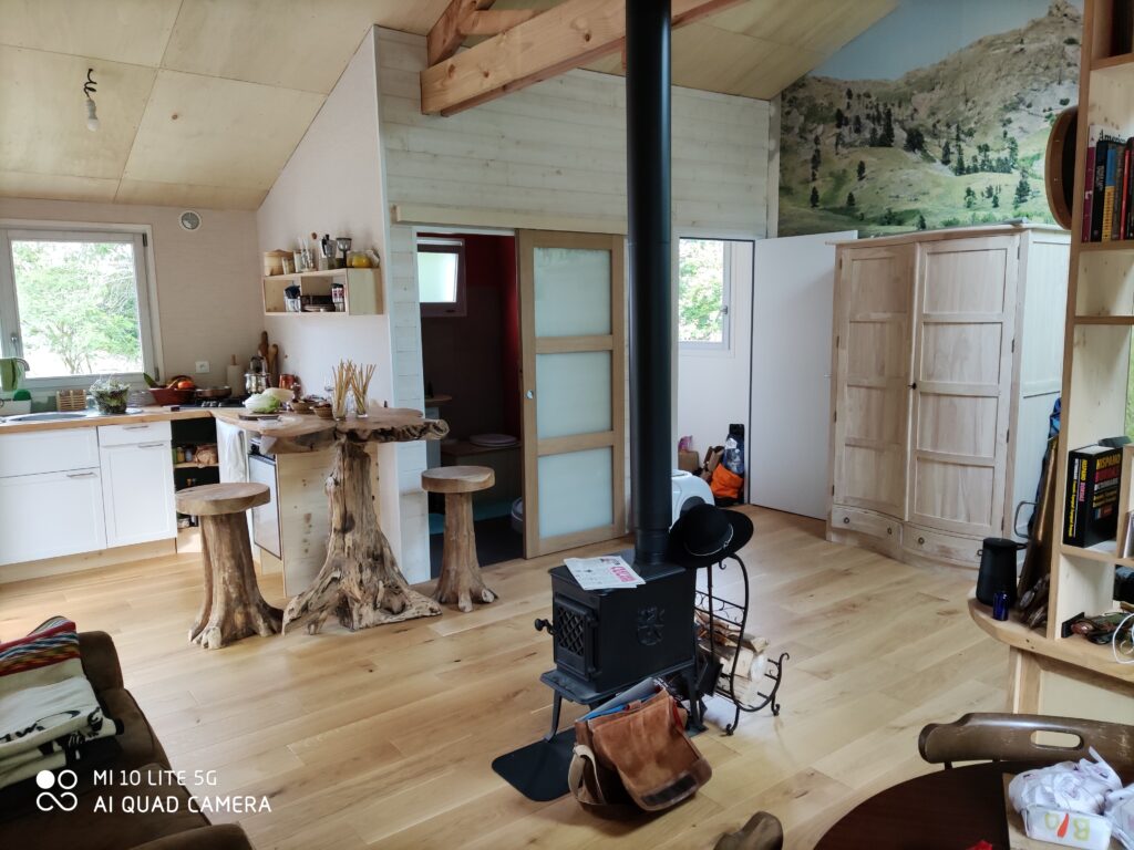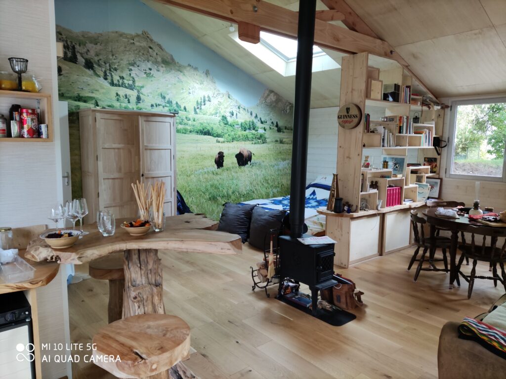 Cette charpente extérieure soutenue par des troncs de châtaigniers lui donne ce style cabane des bois ; accentué par son intérieur aménagé principalement de meubles sur mesure ainsi que sa table en plateau brut poncé et huilé. Un petit poêle à bois suffit à le chauffer, deux panneaux solaires sur batterie pour la lumière et les installations PC et mobiles.Une toilette sec et une petite phytoépuration le rendent propre et presque autonome puisque seule l’eau courante est sur le réseau.Nous aurions pu pousser l’habillage extérieur en planche naturelle, hélas les règles urbanistiques de la commune ne nous l’ont pas permis.