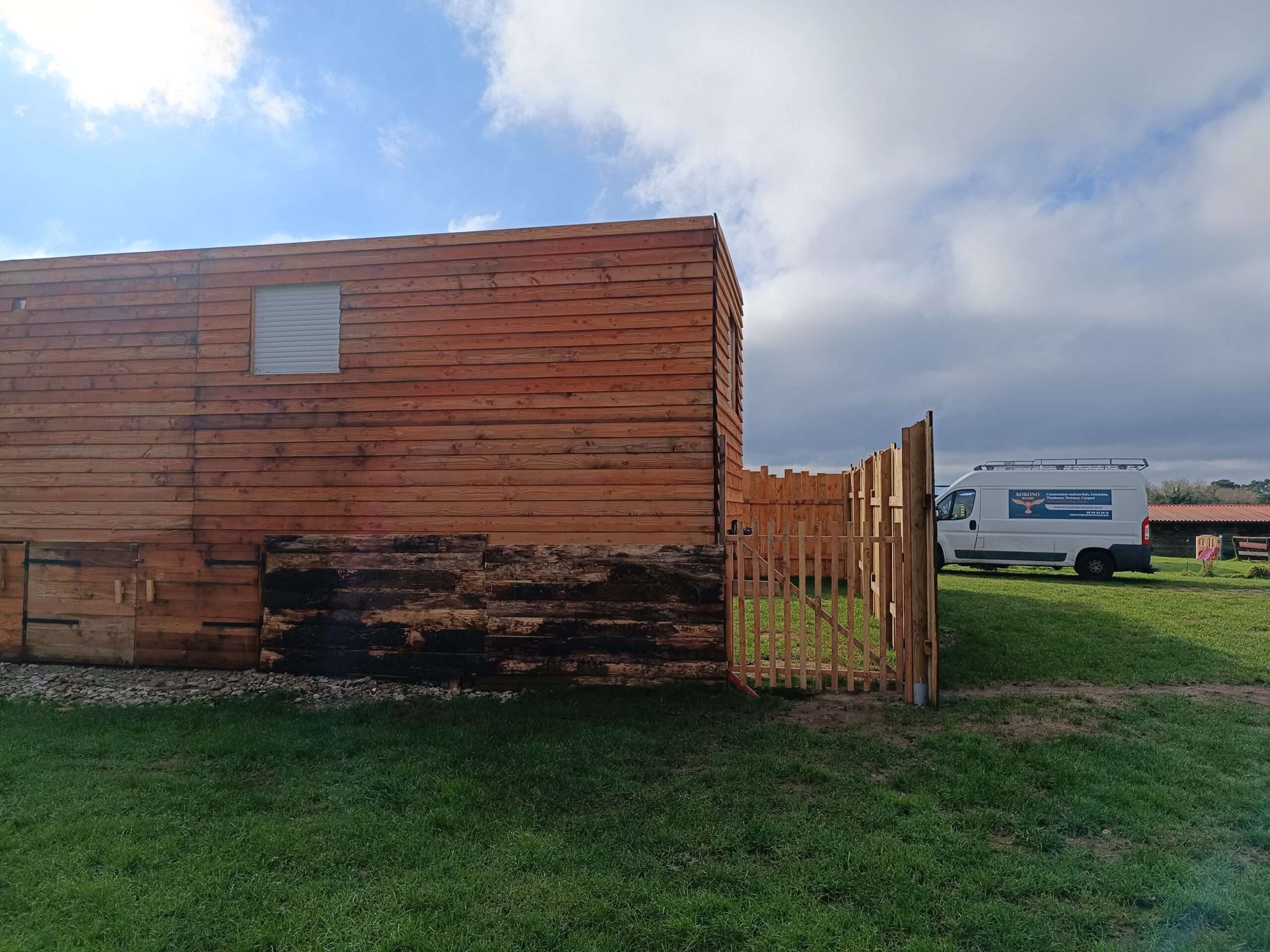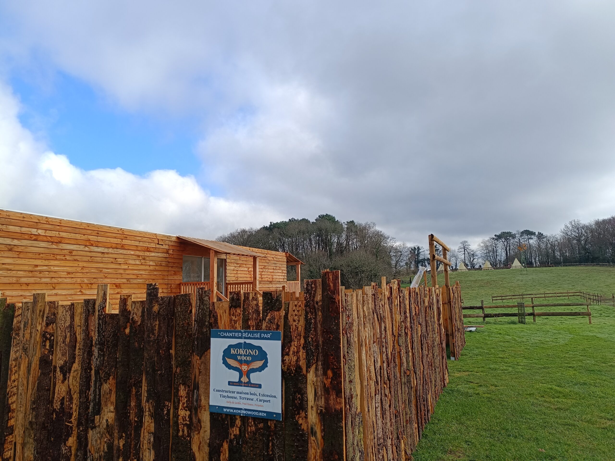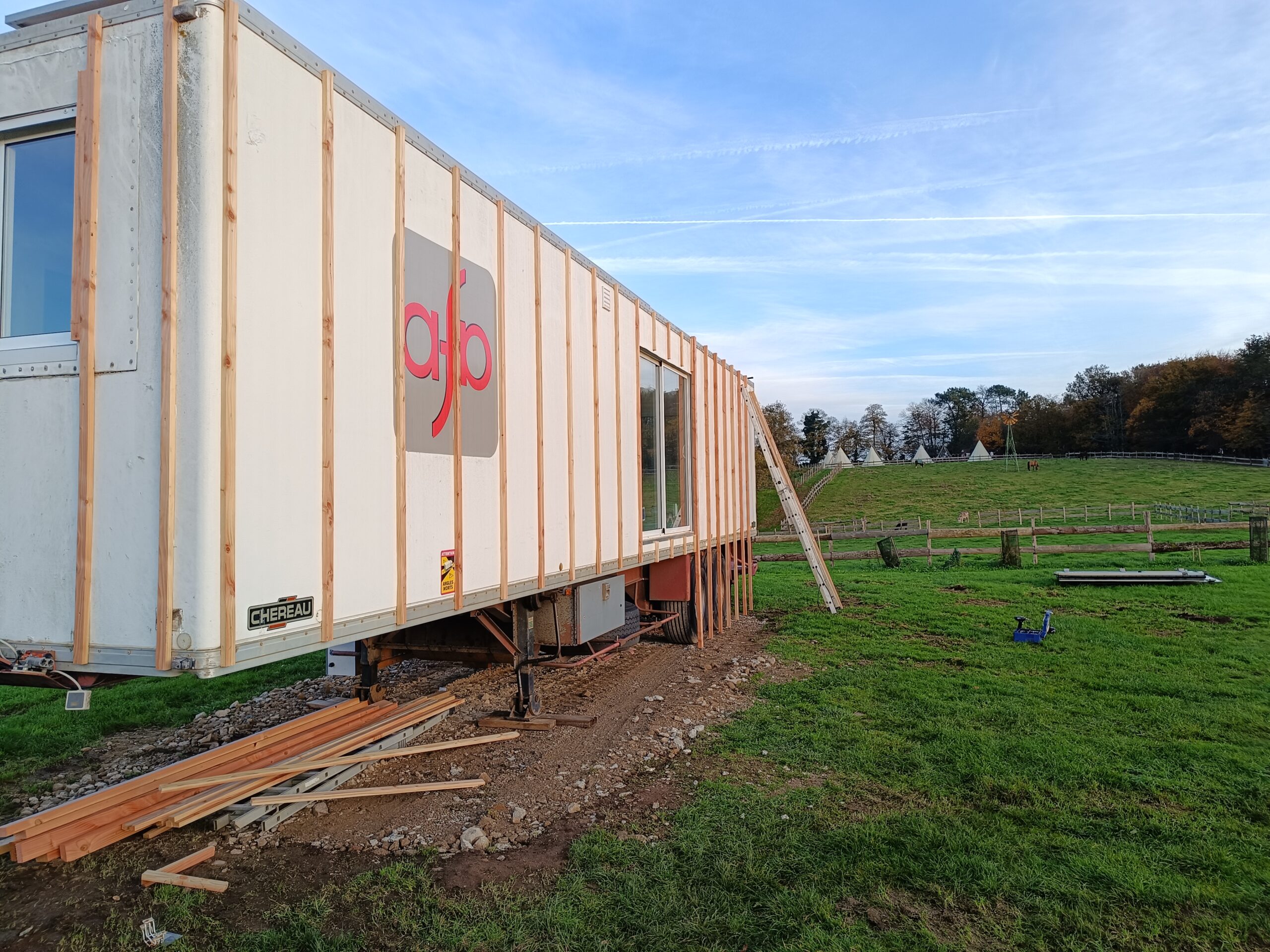 Au cœur du Ranch de Calamity Jane, à Languidic dans le Morbihan (56), nous avons réalisé une transformation unique : l’habillage complet d’une remorque de camion poids lourd en véritable habitation au style ranch western, inspiré de l’univers des forts de l’époque et des barrières anti-indien emblématiques.