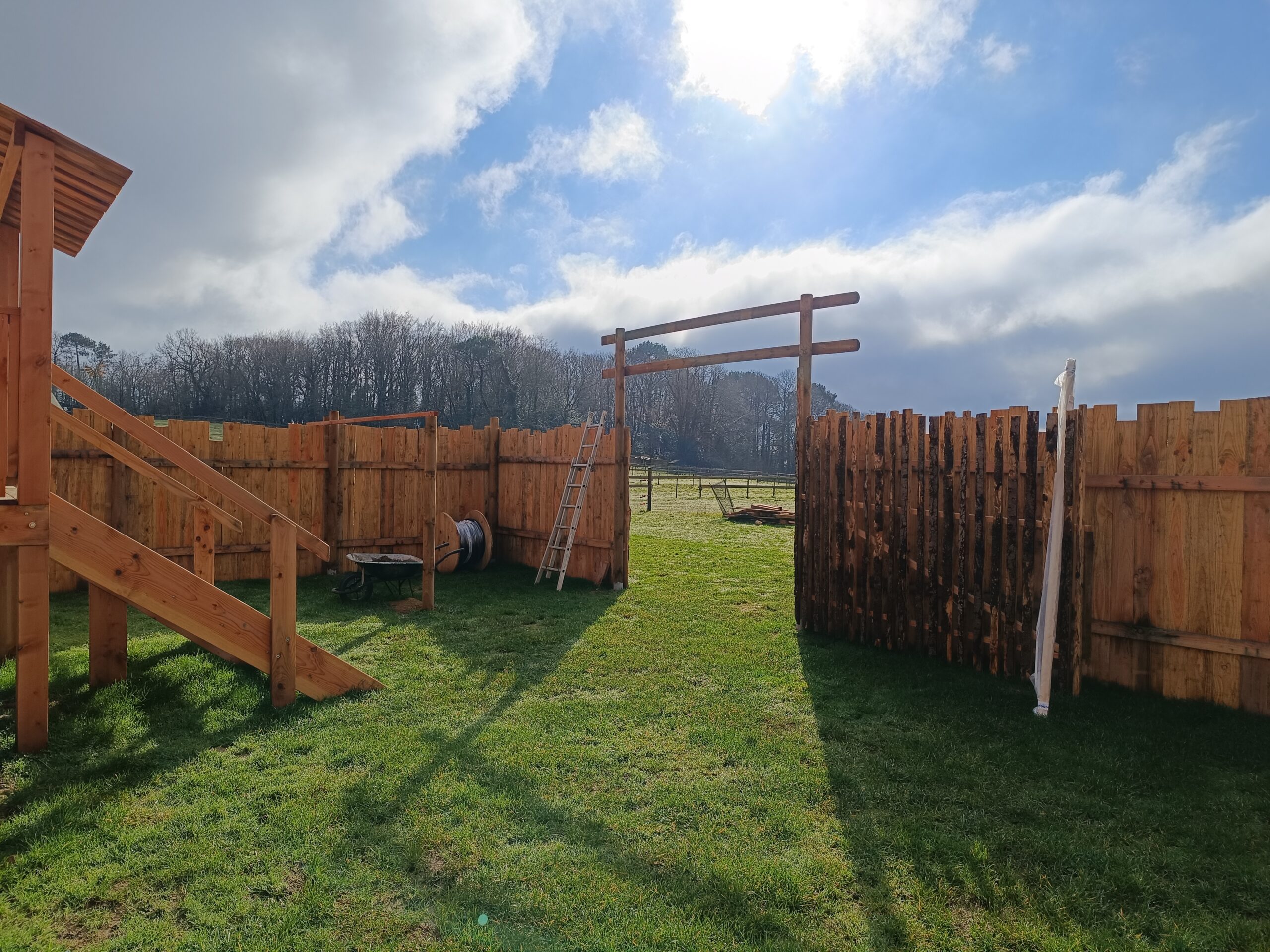 Des barrières en rondins naturels, fabriquées à partir de troncs bruts pour recréer l’ambiance d’un fort western avec un effet « barrière anti-indien ».